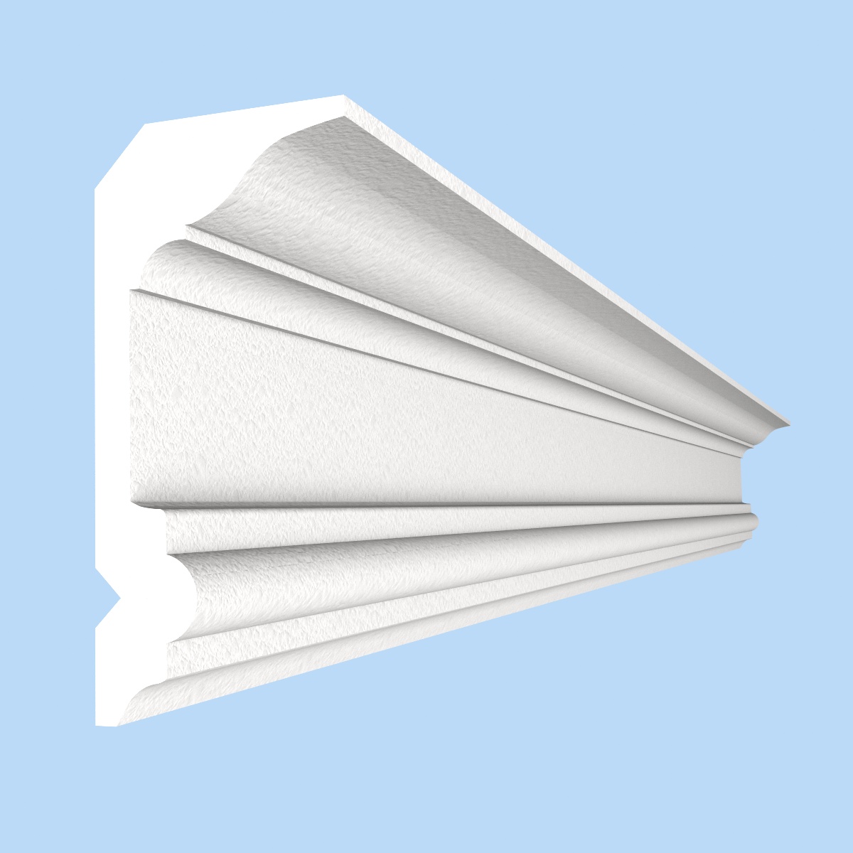 Эта модель хорошо подходит для помещений со средними или высокими потолками, способствуя визуальному увеличению пространства комнаты. Эффект достигается благодаря ступенчатому рельефу карниза. Эту модель можно использовать в 2х положениях, как по высоте, так и по ширине. При расположении широкой части карниза на стене, а узкой на потолке, высота стены визуально уменьшится, поэтому, если у вас низкие потолки, стоит развернуть этот профиль широкой стороной к потолку, что визуально увеличит высоту потолка.